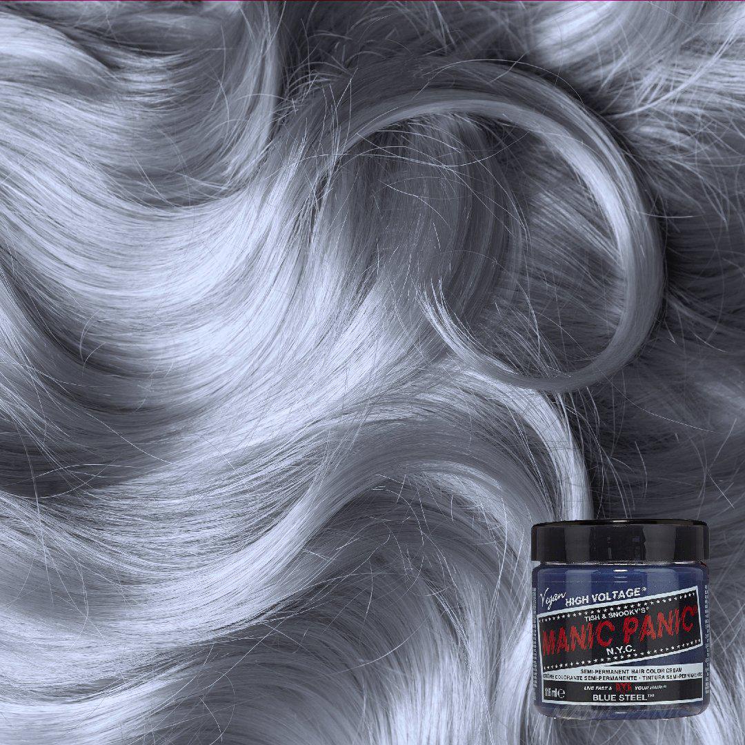 Blue Steel is a cool, silver hair dye with blue undertones. For best results, we recommend lightening hair to the lightest level 10 blonde and toning hair that has yellow tones before use to avoid undesired hues. Pastels/Greys/Toners contain less pigment than our vivid shades and will fade from your hair faster.